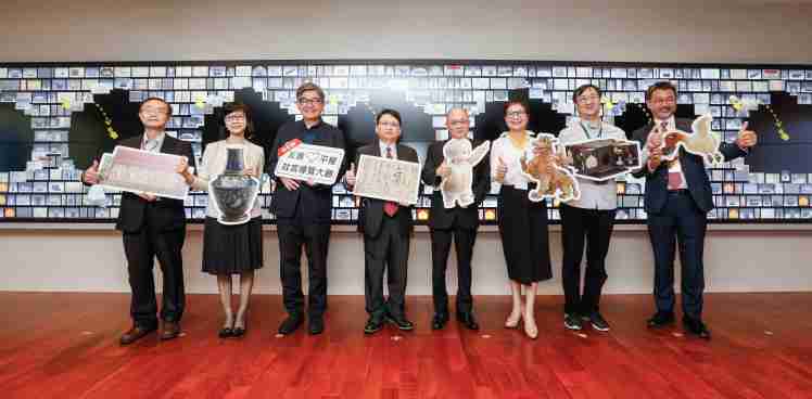 赏金国际携手创利空间为故宫建置的智慧文物互动导览墙及轮播墙,,今日正式启用。。。。(左四:赏金国际新事业暨投资管理总部副总经理杨本豫、、、右四:故宫博物院院长吴密察、、、、右三:太极影音董事长黄宝云)