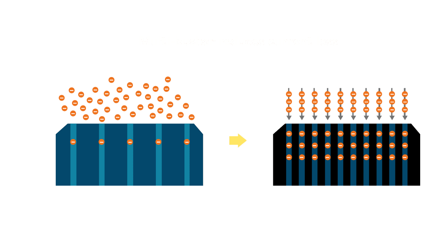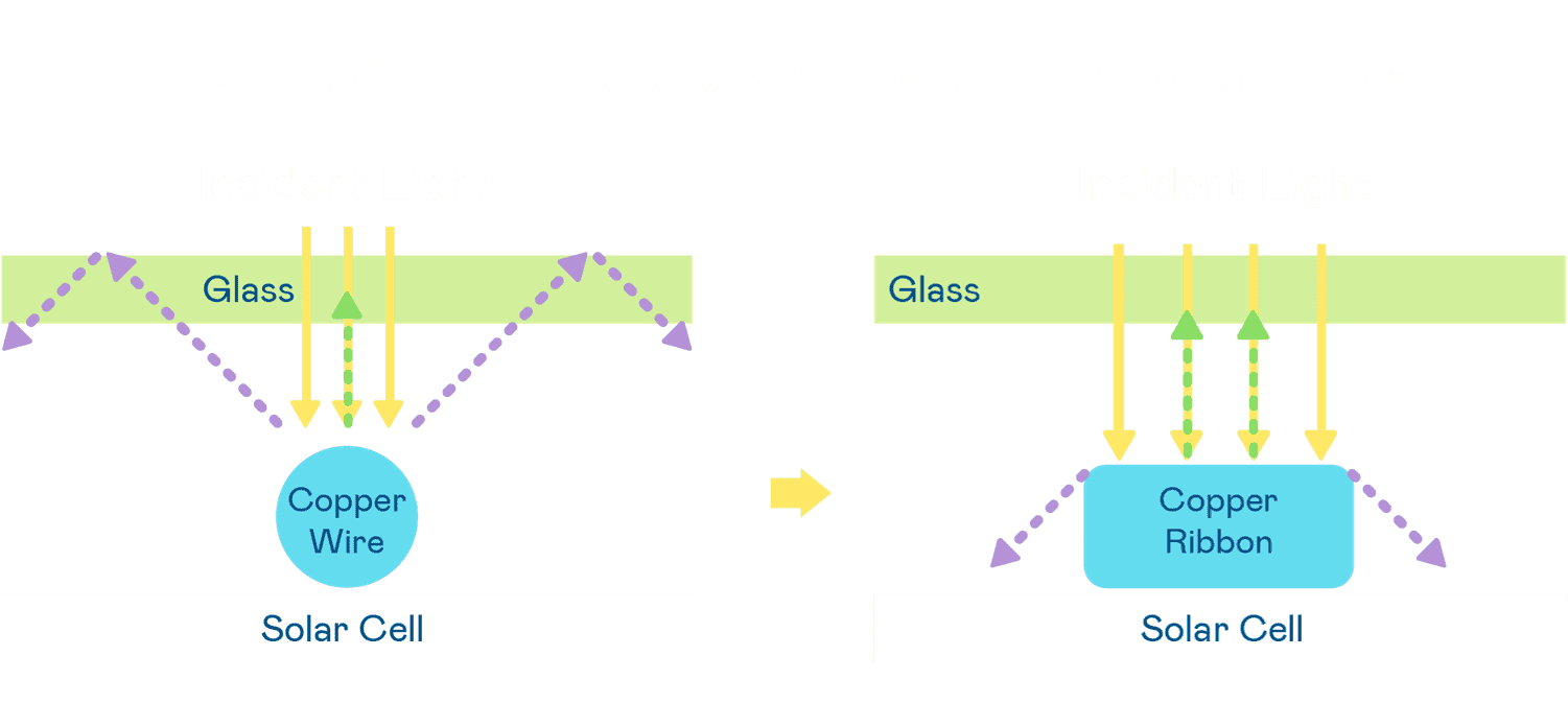 • 电池使用多条铜导线 (Copper wire) 于电池片上形成较短的电流路径,,,,提高电流收集效率,,,,采用圆形设计的铜导线较传统扁平式的铜焊带 (Ribbon),,,可增加入射至电池的光线量。。。