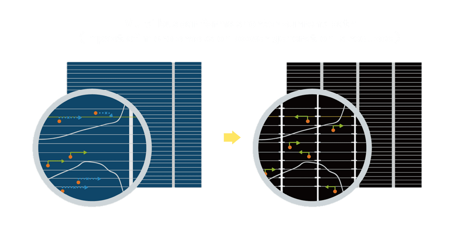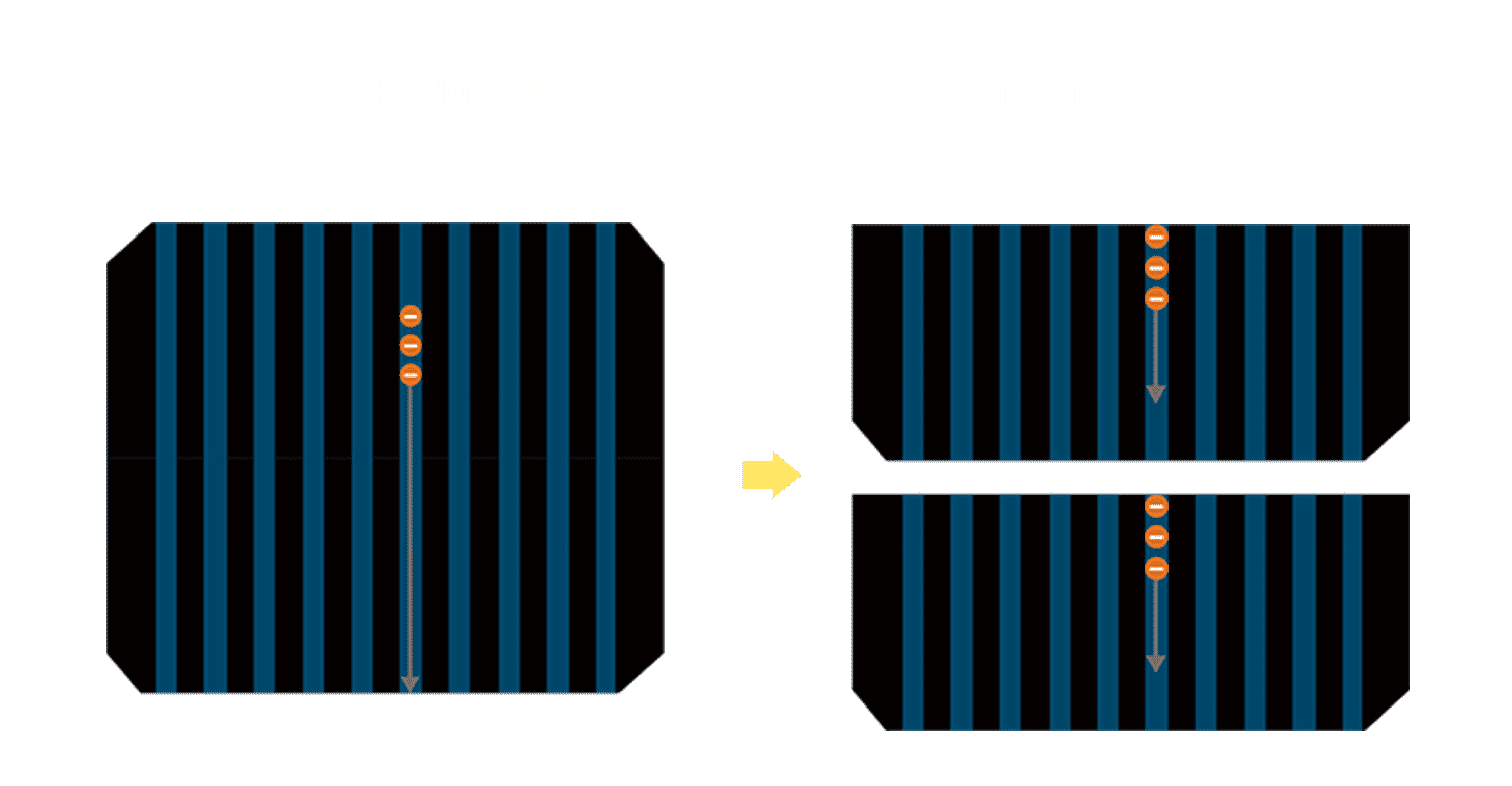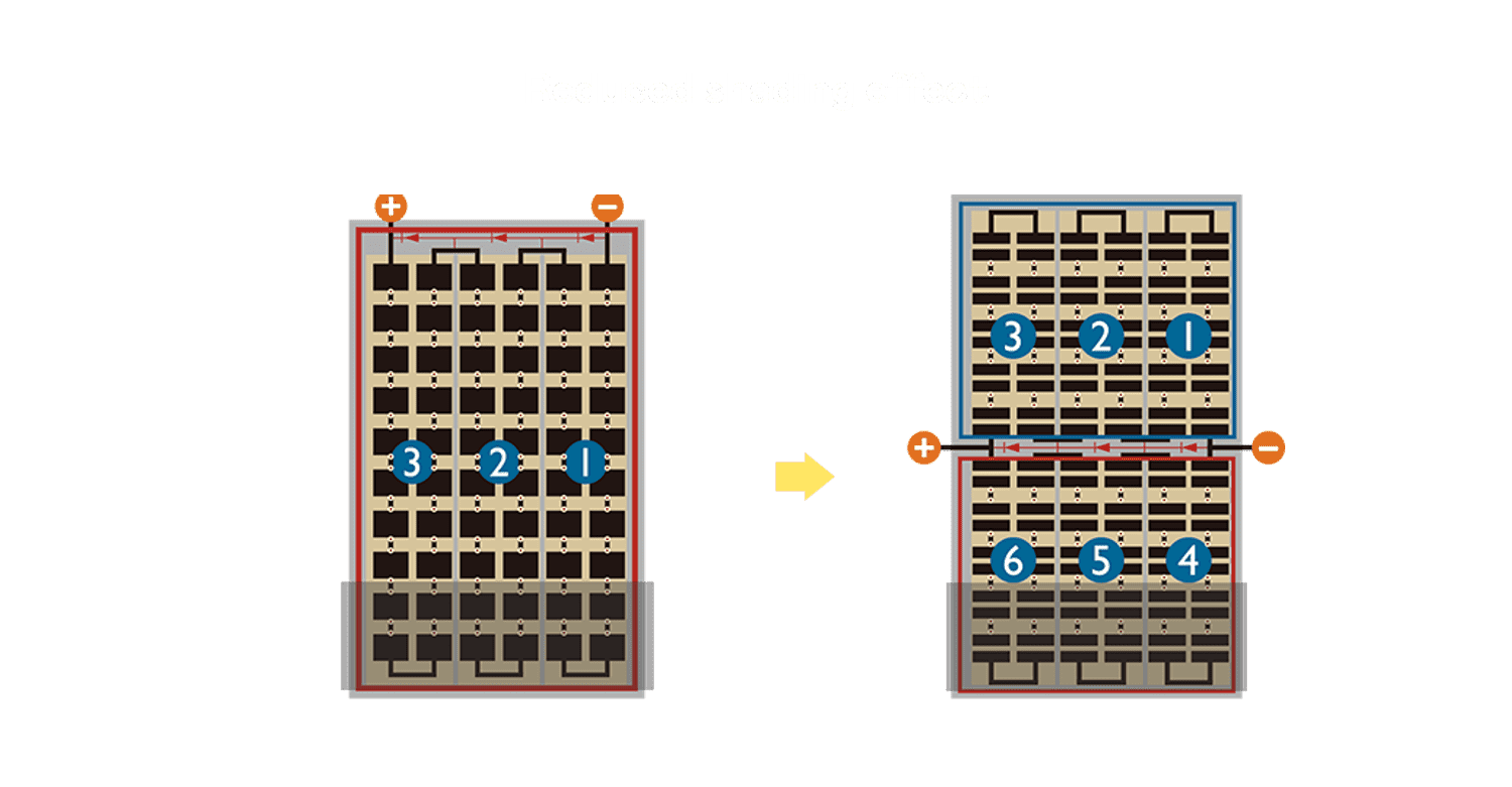 • 结合半切电池,,,,降低遮阴影响、、提升模组抗隐裂能力、、、并减少电阻损耗,,,,进一步提升模组发电效能。。。。