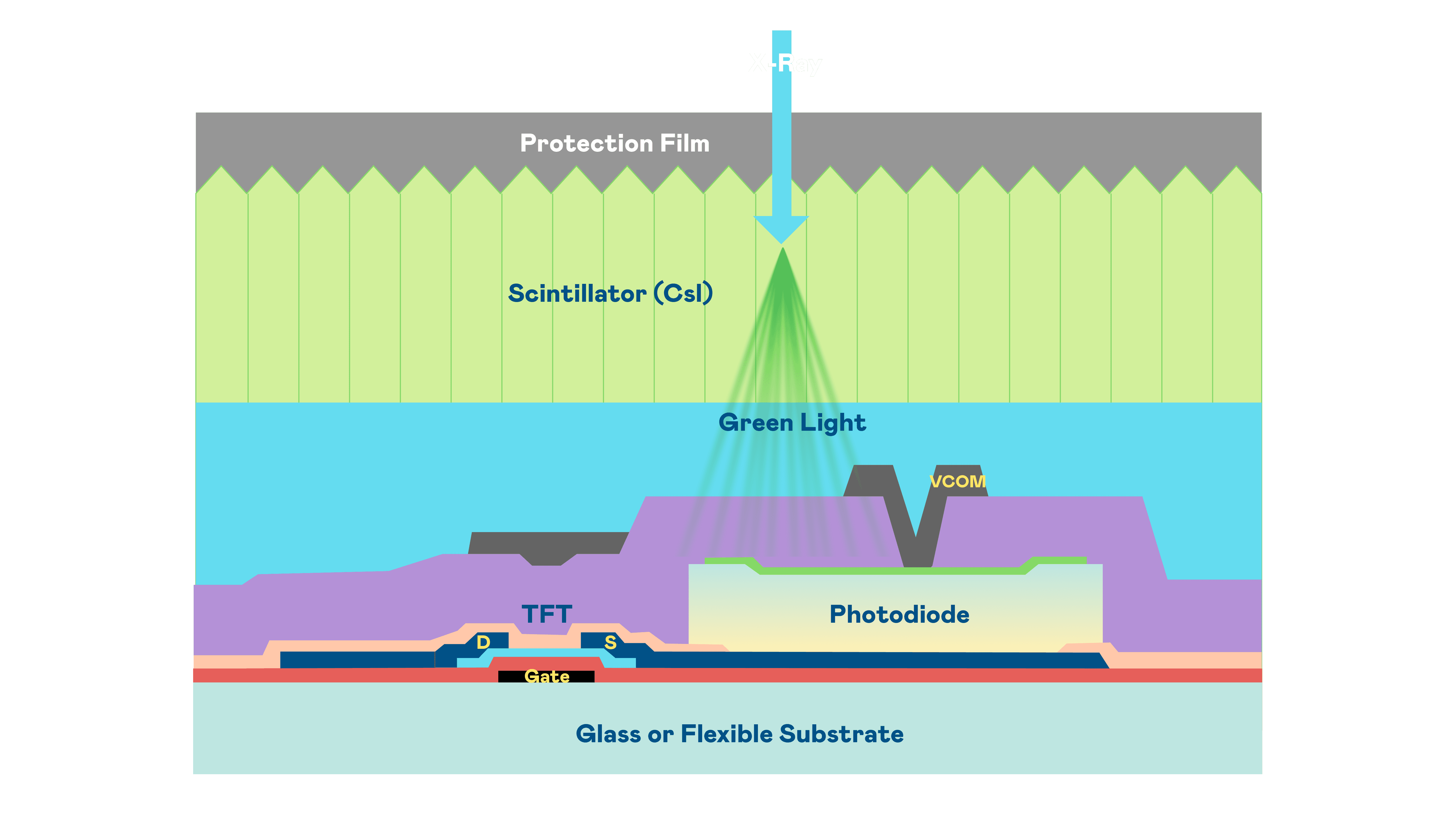 赏金国际的X光影像感测阵列使用薄膜电晶体 (TFT) 作为每个像素的读取开关,,搭配光电二极体(Photodiode)的光电转换元件,,,用以感测X光影像讯号。。